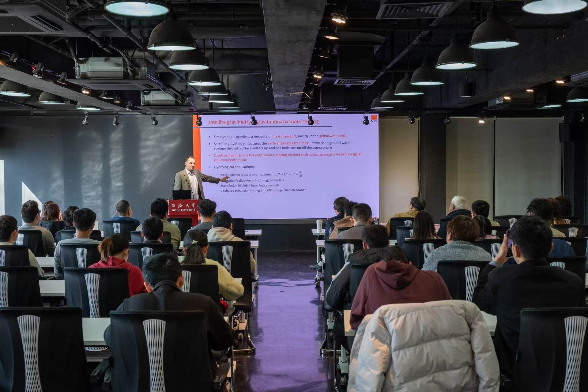 在随后举行的学术报告中,Nico Sneeuw教授以"多源遥感量化全球水循环"为主题,深入阐释了大地测量与遥感技术在水文过程观测领域引发的革命性变革,并列举了他带领团队完成的三项典型成果。报告现场学术氛围浓厚,学生踊跃提问,与 Nico Sneeuw 教授就相关学术问题展开深入探讨。