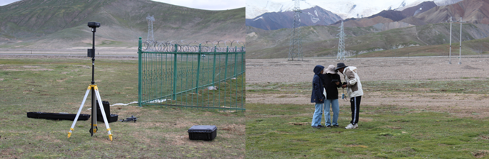 图3 科考队员在西大滩站点架设RTK基站并进行无人机数据采集