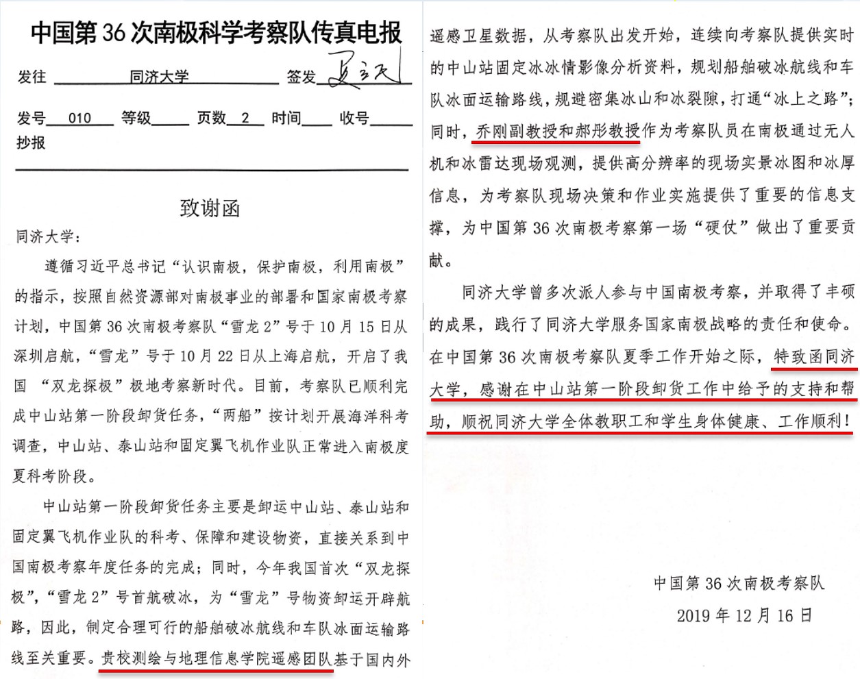 5. 极地科学考察 1)乔刚教授参加中国第35、36次南极科学考察 乔刚教授于2018-2020年间参加中国第35、36次南极科学考察,服务于国家南极战略和极地科普事业。第36次南极科学考察中山站卸货期间,依托测绘性爱电影 遥感团队为雪龙船规划破冰航线和冰面运输路线提供技术支撑并做出了重要贡献,考察队专门致函感谢性爱电影 的支持,本人被中国第36次南极考察队授予“优秀党员”称号。性爱电影 官网、人民日报海外版、搜狐网、澎湃新闻等新闻媒体对南极科考活动进行了广泛报道,获得了公众的广泛关注。